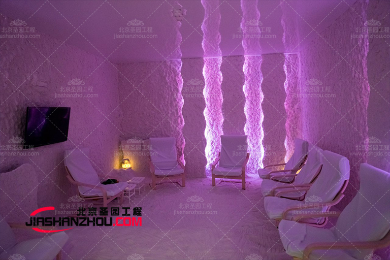 床腳下的長凳也是藍色的軟墊,窗戶上鑲著金色的窗簾。環繞海景的仿真洞穴式主題鹽療房,華麗的現代仿真洞穴式主題鹽療房,享有海景。仿真洞穴式主題鹽療房四周環繞著通向室外露臺的大型推拉門。高高的天花板也使這間仿真洞穴式主題鹽療房感覺寬敞。它有堅實的金橡木地板和簡單的白色鹽墻壁。床本身采用現代懸臂式設計,給人一種漂浮的錯覺。